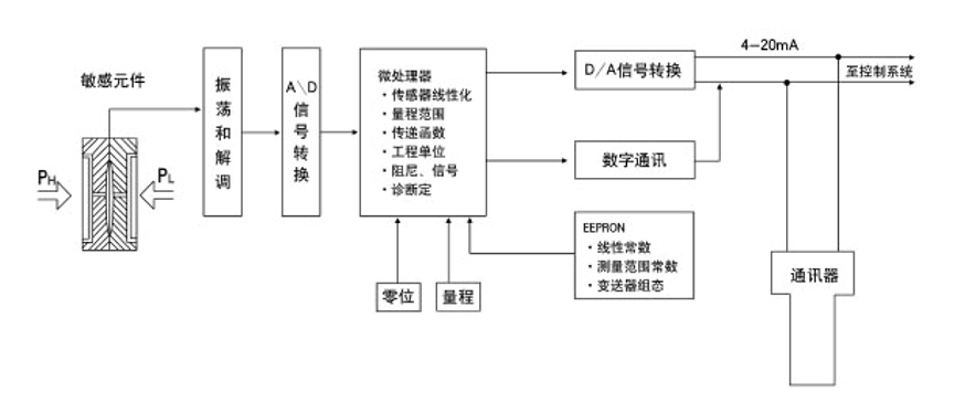 差压变送器的核心是一个电容式传感器,称为“S”室。传感器是一个完全密封的组件,过程压力通过隔离膜片和灌充液硅油传到传感膜片引起位移。传感膜片和两电容极板之间的电容差由电子部件转换成4~20mADC的二线制输出的电信号。