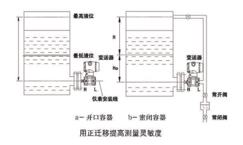变送器的正迁移适用于敞口或非敞口容器内液位的测量。安装时正压室连接容器接口,负压室与大气或者低压侧相通。