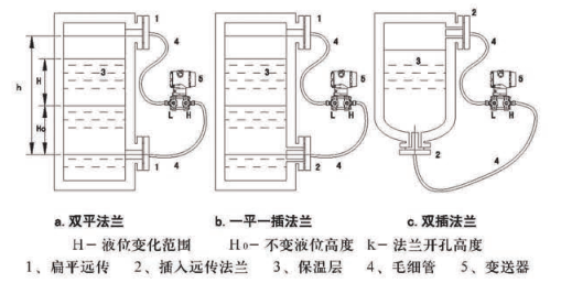 对于密闭的容器而言,在测量液位的同时又要保证内部的介质不能泄露,这时就要采取负迁移的措施来实现液位的测量。由于差压变送器高低压两个接口安装时有高度差,故调整时应加迁移。负压远传法兰在上方加负迁移,计算方法如下: