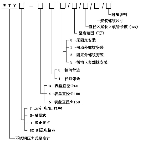 WTY系列全不锈钢液体压力式温度计能显示被测液体、气体的温度。由于其温包体积小、耐震动、灵敏度高、寿命长、安装方式多样等优点,被应用于石油化工、机械、制药、食品、船舶等生产过程中的检测和控制。
