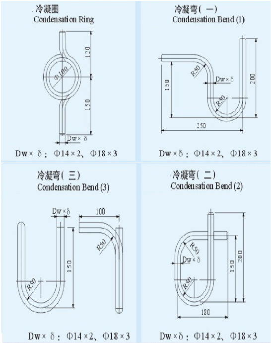 4、压力表冷凝弯管规格:碳钢材质为φ18×3无缝钢管;不锈钢材质为φ14×2或者φ14×3无缝钢管