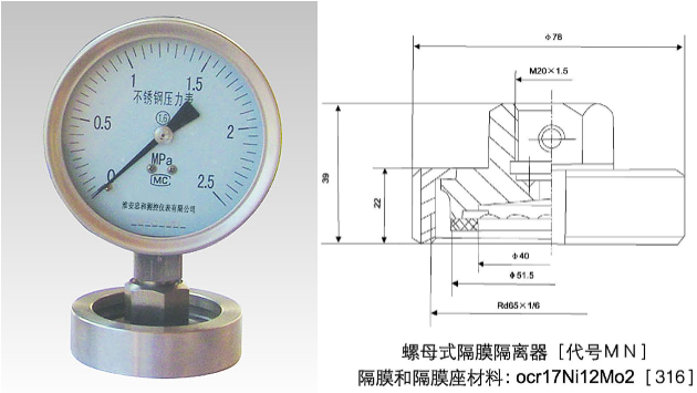 9、MN螺母式卫生型隔膜压力表:量程上限0.4~2.5MPa