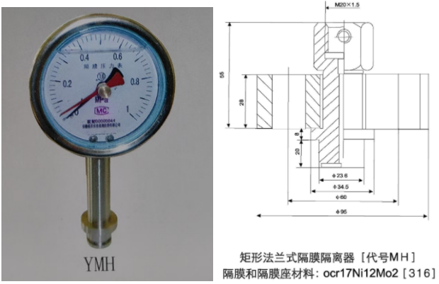 10、MH矩形法兰式卫生型隔膜压力表(均质机用):量程上限10~60MPa