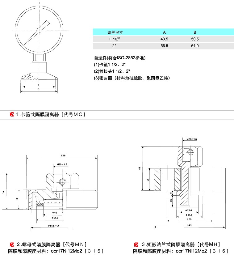 三、隔膜压力表选型表: