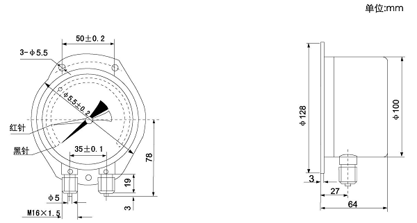 2、双针压力表的工作原理是基于弹性元件(测量系统中的弹簧管)的弹性变形。即在被测介质的压力作用下,迫使两弹簧管之末端各自产生相应的位移,借助于拉杆经齿轮传动机构的传动并予放大,由固定于此轮轴上的红、黑指针将两个被测值分别在刻度盘上指示出来。