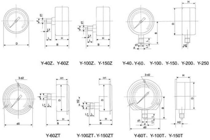 压力表表盘直径(mm):φ40 φ50 φ60 φ100 φ150 φ200 φ250