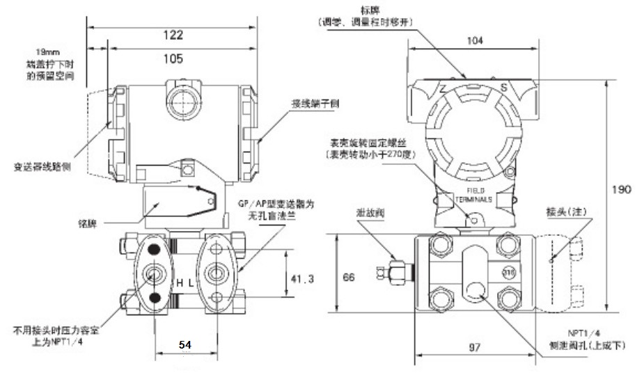 导压连接:在压力容室上连接螺孔为1/4-18NPT引压接头上的连接螺孔为1/2-14NPT, 其中心距为54mm,外形尺寸见下图: