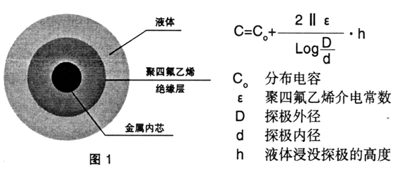 射频电容液位变送器测量原理为探级与导电液体构成一电容器,其中探级线的金属内芯为电容的一极,导电液体为电容的另一极,中间为高稳定性的聚四氟乙烯,即探级线的绝缘外层作为两极之间的介质,随着液位的变化,液体包围探级线的面积随之改变,使构成电容器两极的相对面积改变,导致电容的变化,根据同心筒状电容的公式可写出液位高度与电容的关系: