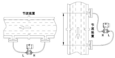 对不能用导压管引出的介质,可用双法兰差压变送器进行流量测量,其装置见下图,测量水平管道时,两法兰同在一水平面上,不存在液位差,不考虑迁移,测量垂直管道是,始终承受(r-r0)H的液位压差故仪表应有(r-r0)H正迁移量。