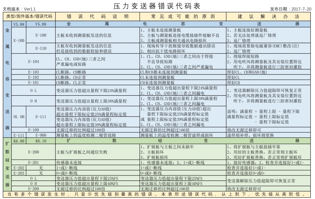 六、双法兰液位变送器主机操作错误代码参考说明: