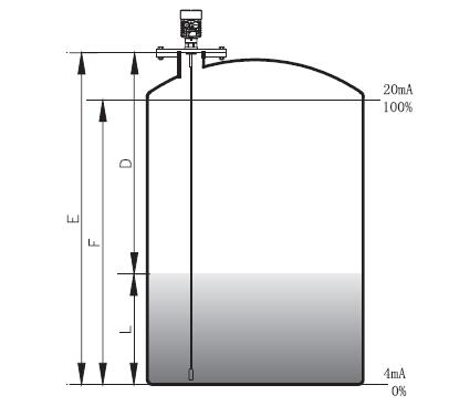 通过输入空罐高度E(=零点),满罐高度F(=满量程)及一些应用参数来设定,应用参数将自动使仪表适应测量环境。对应于4~20mA输出。