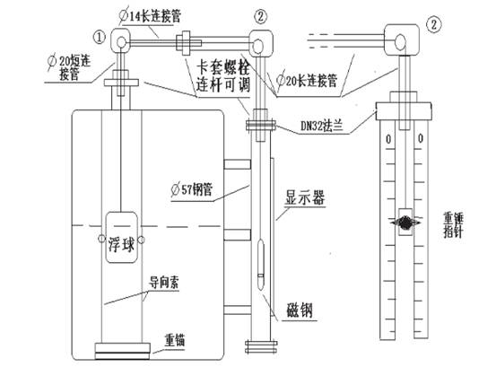 在仪表安装时,罐内应还未有被测介质,浮标在罐内的底部时,重锤指针部分的红色尖头指示应指在标尺测量范围的顶部“零”值上,否则要调整钢丝长度。
